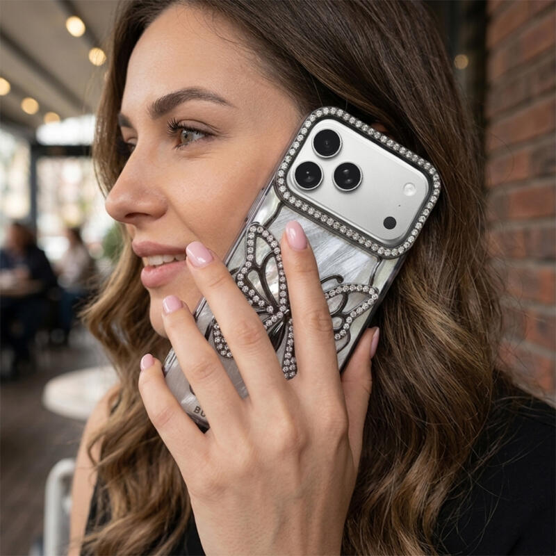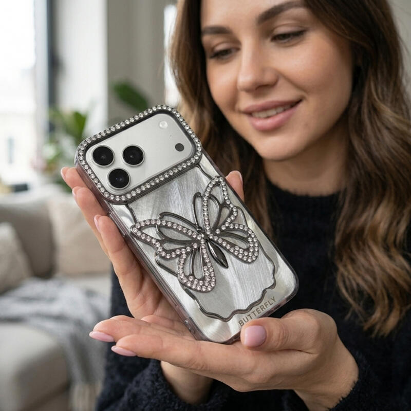 El protagonista es un majestuoso diseño de mariposa con incrustaciones de cristales brillantes que capturan la luz desde cualquier ángulo. El acabado tipo mármol nacarado en el fondo aporta una textura visual sofisticada, mientras que el borde de la cámara, también decorado con pedrería, realza el módulo fotográfico de tu iPhone.