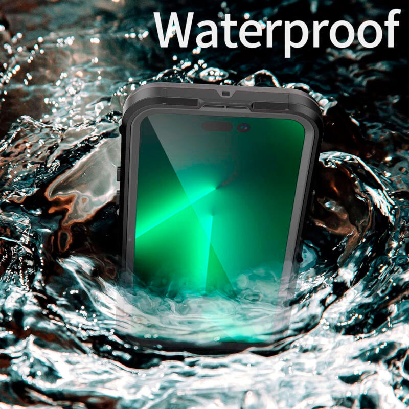 Estuche impermeable y sumergible. Resiste hasta 2 metros debajo del agua y te permite tomar fotos y videos. Es resistente a golpes y caídas. Protege de la suciedad y el polvo. Tiene acceso fácil a los botones de volumen, vibrador y al puerto de carga.