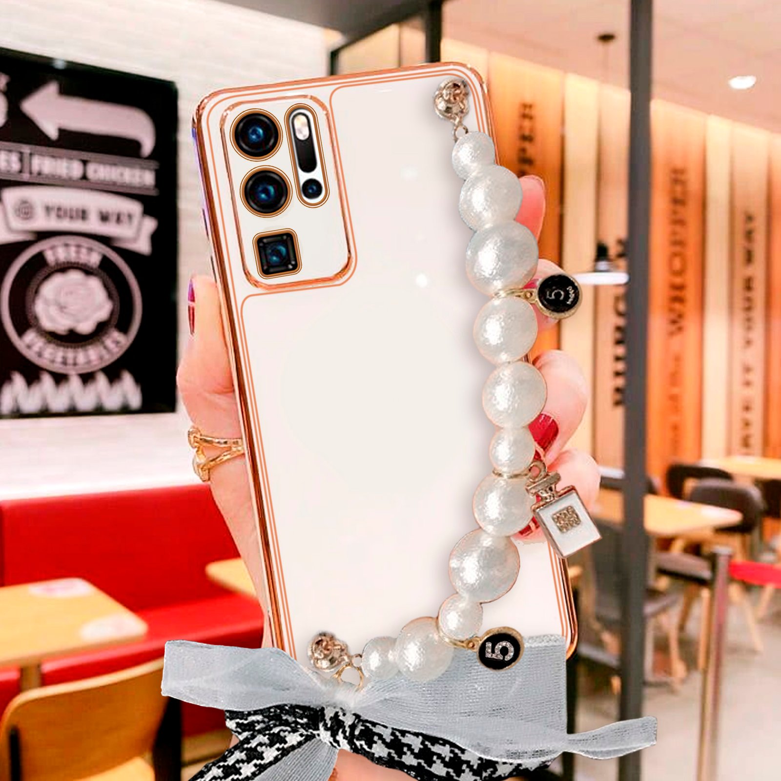 Con este caso protege tu teléfono de golpes y raspones. Es fácil de poner y quitar, dá libre acceso a todas las entradas y botones. El diseño es brillante la orilla tiene pintura metálica dorada. Está elaborado en TPU ligero y delgado que no se pone amarillento con el tiempo, no agrega peso extra a tu iPhone. Cuenta con un agarrador de perlas y dijes en la parte de atrás que hacer ver tu iPhone más femenino y elegante.