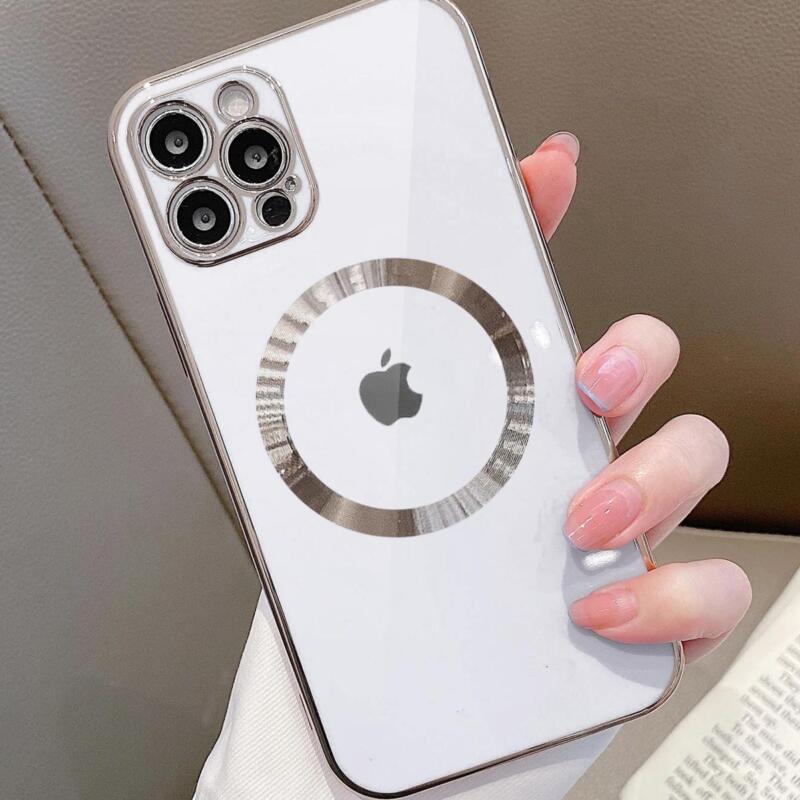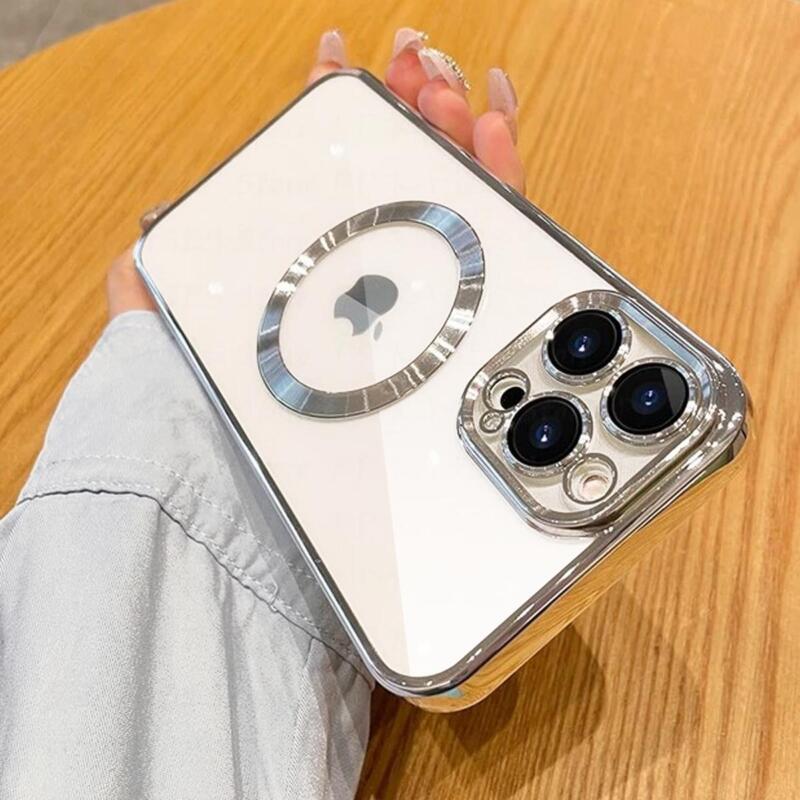 Funda de TPU transparente. Sus orillas tienen un diseño metálico, haciéndolo resistente a los golpes y caídas. Se alinea automáticamente con el cargador Magsafe gracias a su círculo magnético con alineación precisa. También cuenta con cortes precisos en las bocinas y botones. *NO incluye cargador inalámbrico.